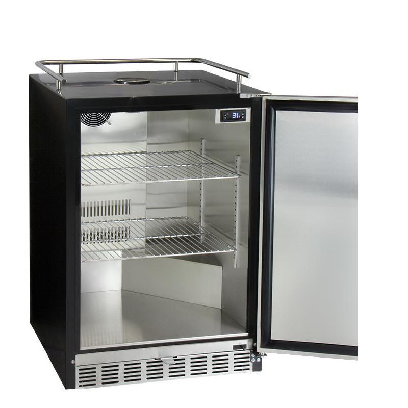 This sleek kegerator, standing at 34-1/8 inches in height and 24 inches in width, offers optimal beer storage and dispensing solutions. Weighing 115 pounds, it accommodates various keg sizes: one full-size / 1/2-barrel, two 1/4-barrel slims, three 1/6-barrels, or three 5-gallon ball/pin lock kegs. Its black exterior cabinet with stainless steel accents, along with a stainless steel door featuring a towel bar and curved handle, adds a touch of sophistication. Equipped with two faucets on a stainless steel draft beer tower, this kegerator comes with a range of accessories including a keg coupler, double gauge regulator, CO2 tank, and deluxe cleaning kit. With an automatic defrost system, adjustable thermostat, and digital controls, this kegerator ensures a seamless beer dispensing experience while being suitable for built-in use, offering a year warranty on labor and parts and a 5-year warranty on the compressor.
