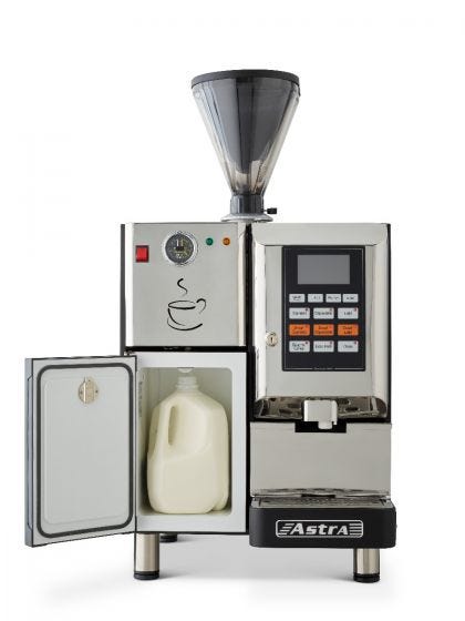 Anyone can produce barista-made quality with Astra’s fully automated SM111 espresso machine which produces up to 14 drink selections with the touch of a button. Includes a single hopper and fully integrated refrigerator with a vacuum valve that prevents milk from entering the boiler and self-cleaning process that automatically cleans and rinses components every 15 minutes and after every drink. Available mobile cart with storage and configuration that can operate from a standard 110 V outlet.